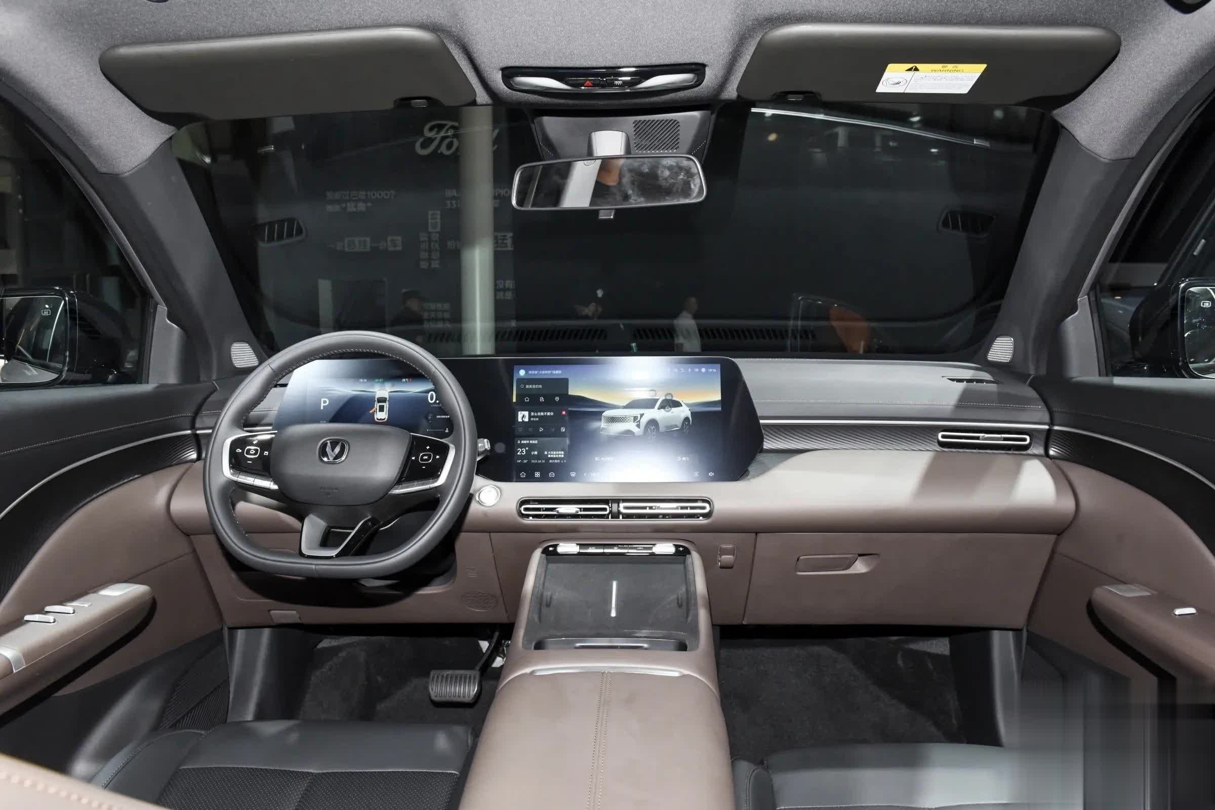 除了外观以外,全新长安CS55 PLUS的内饰变化也是相当大。该车采用了全新的环抱式设计,采用酒红色和黑色的双拼设计,看起来还是很有质感。整个中控台变得更加简洁,搭载了大尺寸的双联屏,再加上围绕整个前排的氛围灯,可谓是科技感满满。值得一提的是,该车的中控屏下方还有几个常用功能的实体按键,这一点值得好评。方向盘的造型也变得更加精致,并且使用了全新的怀挡设计,这也让中央扶手台的可用区域更大。