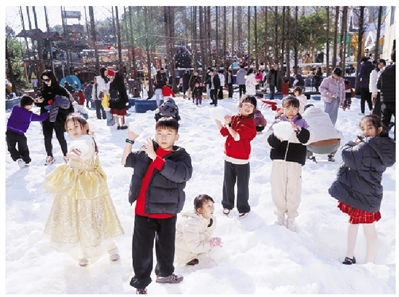 “看到有雪景,特别感兴趣,就带孩子来玩。”游客张女士说。和她一样,许多家庭被社交平台上的雪景画面吸引而来。“小孩子的体验感很不错。”杭州游客鲁先生一边说,一边鼓励身边的孩子向镜头喊出“开心”。